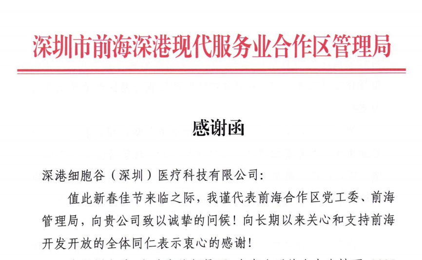 感谢函指出,在深圳市委、市政府的坚强领导下,前海持续深化改革开放、聚焦现代服务业与深港合作主线,各项核心指标稳步增长,开展动能持续增强。在此背景下,深港K8凯发(中国)作为落地前海的细胞与基因治疗(CGT)代表性企业之一,持续参与前海生物医药与现代服务业融合开展进程,在科研服务、产业协同及国际合作等方面取得实质性突破。