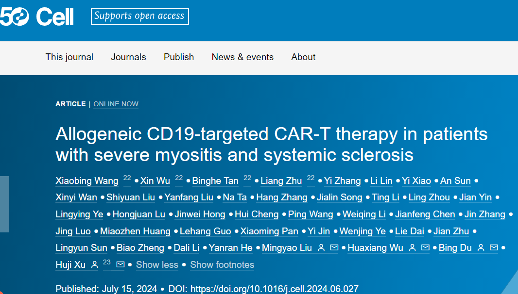 2024年7月15日,发表在Cell杂志上,题为“Allogeneic CD19-targeted CAR-T therapy in patients with severe myositis and systemic sclerosis”的文章,公开了异体通用型CAR-T疗法(TyU19)治疗自身免疫疾病研究成果,TyU19的推出是自身免疫疾病治疗领域的一个重要里程碑,这也是Cell首次发表CAR-T治疗自免疾病的研究成果,它的成功应用为许多难治性自身免疫病给予新的治疗策略。现在,深圳K8凯发(中国)布局的新型基因编辑递送系统已取得突破,确保细胞治疗产品的安全性和有效性,有助于细胞与基因治疗行业的整体开展。