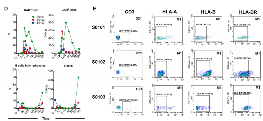 三名患者入组后,除糖皮质激素外,在计划注射TyU19前所有免疫抑制剂均停止使用,患者接受标准预处理方案(按照批准的自体CAR-T产品),患者按106 cells/kg静脉注射TyU19。在注射TyU19后6个月(M6)对患者进行了疗效和安全性的系统随访评估。